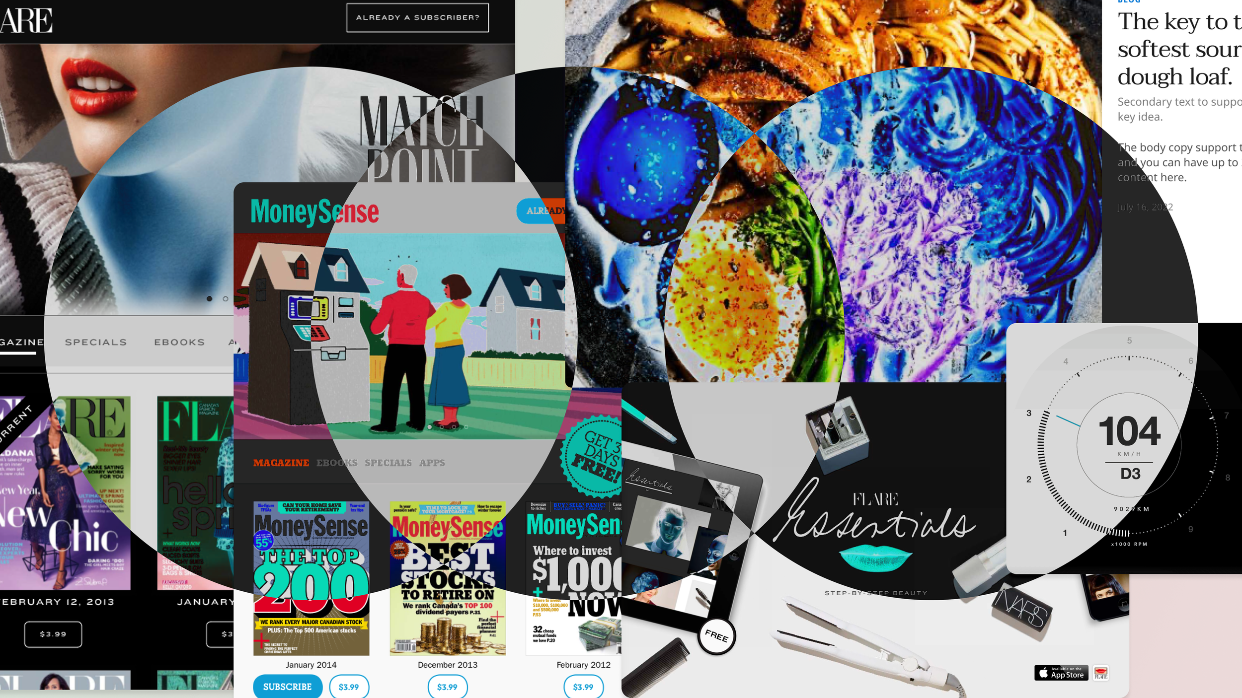 A collection of digital concepts and visual explorations from my first design job at Rogers Publishing, including Macleans, Flare, Chatelaine (EN + FR), Hello!, Sportsnet, Marketing Magazine, and Today’s Parent. These experiments shaped my understanding of layout, hierarchy, and system thinking.